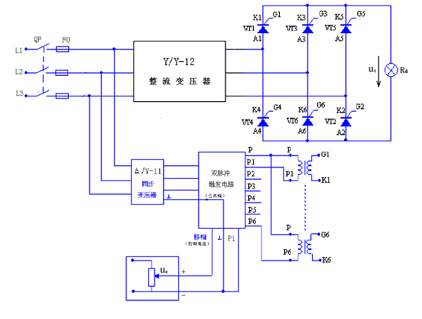 三相橋式全控電路 三相橋式全控電路TR為三相整流變壓器,其接線組別采用Y/Y-12。VT1~VT6為晶閘管元件,F(xiàn)U1~FU6為快速熔斷器。TS為三相同步變壓器,其接線組別采用△/Y-11。P端為集成化六脈沖觸發(fā)電路+24V電源輸出端,接脈沖變壓器一次繞組連接公共端。P1~P6端為集成化六脈沖觸發(fā)電路功放管V1~V6集電極輸出端,分別接脈沖變壓器一次繞組的另一端。UC端為移相控制電壓輸入端。
